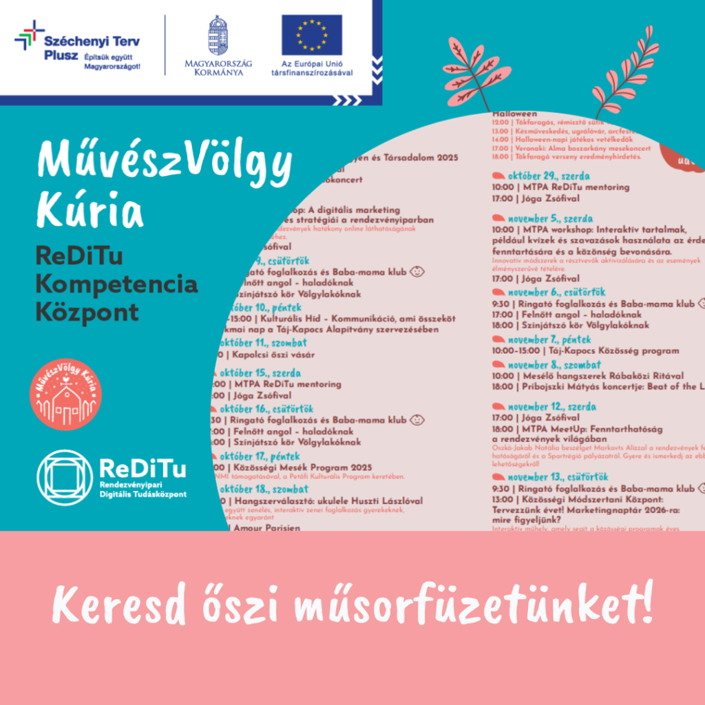 Hamarosan elérhető a MűvészVölgy Kúria 2025-ös őszi műsorfüzete! Keressétek az iskolákban, óvodákban, faluházakban és önkormányzatoknál a környéken, hogy elsőként értesüljetek idei programjainkról! Koncertek, gyerekprogramok, felnőtt […]