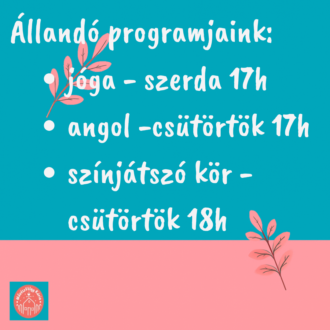 ☝ Várunk TIteket állandó programjainkkal: jógával, színjátszó körrel, nyelvórákkal és workshopokkal, koncertekkel, zenei programokkal is!
